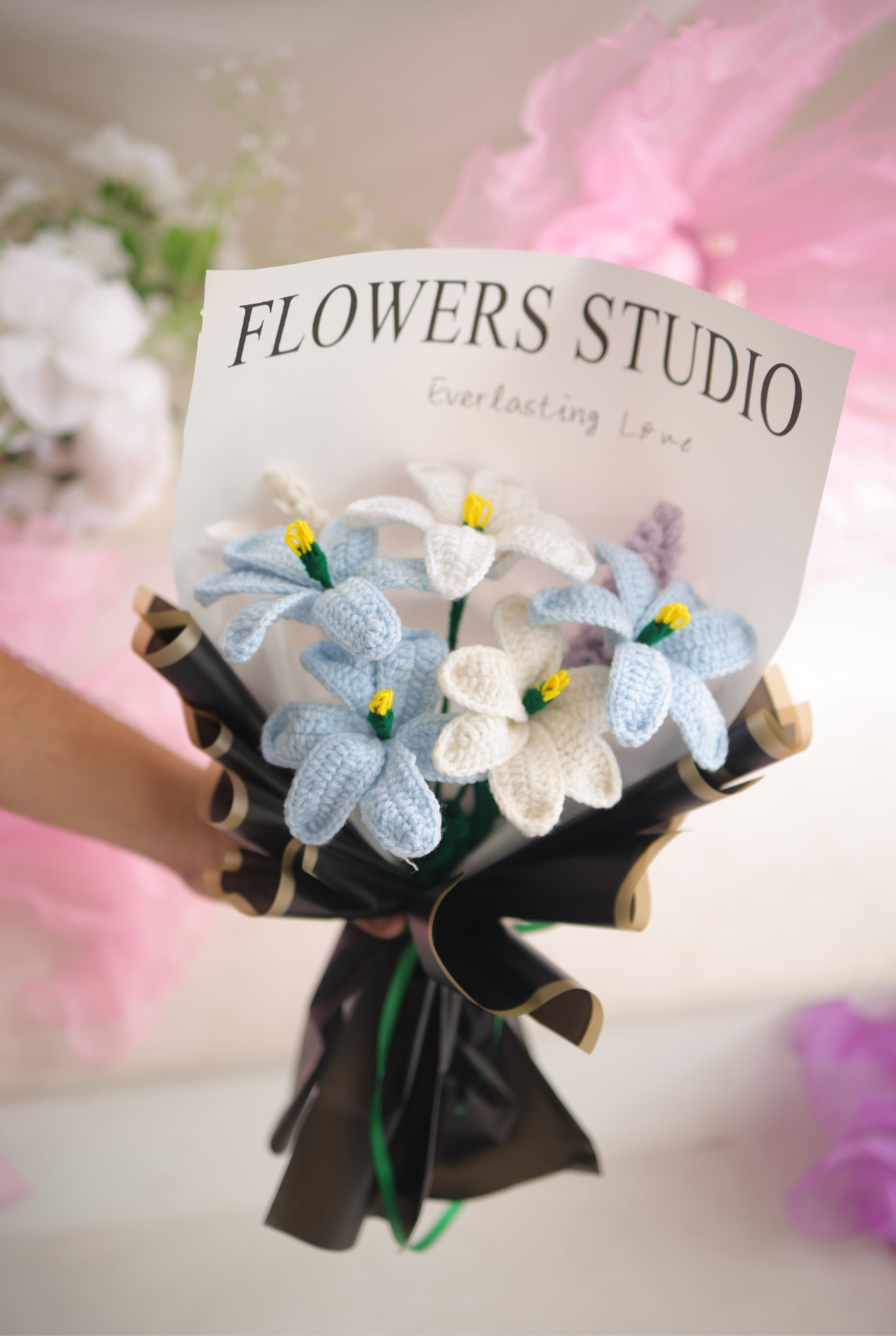 A handcrafted bouquet of crochet flowers, made with love and care. The bouquet measures 14 inches and can be easily customised to suit your style, colour preference, or occasion.