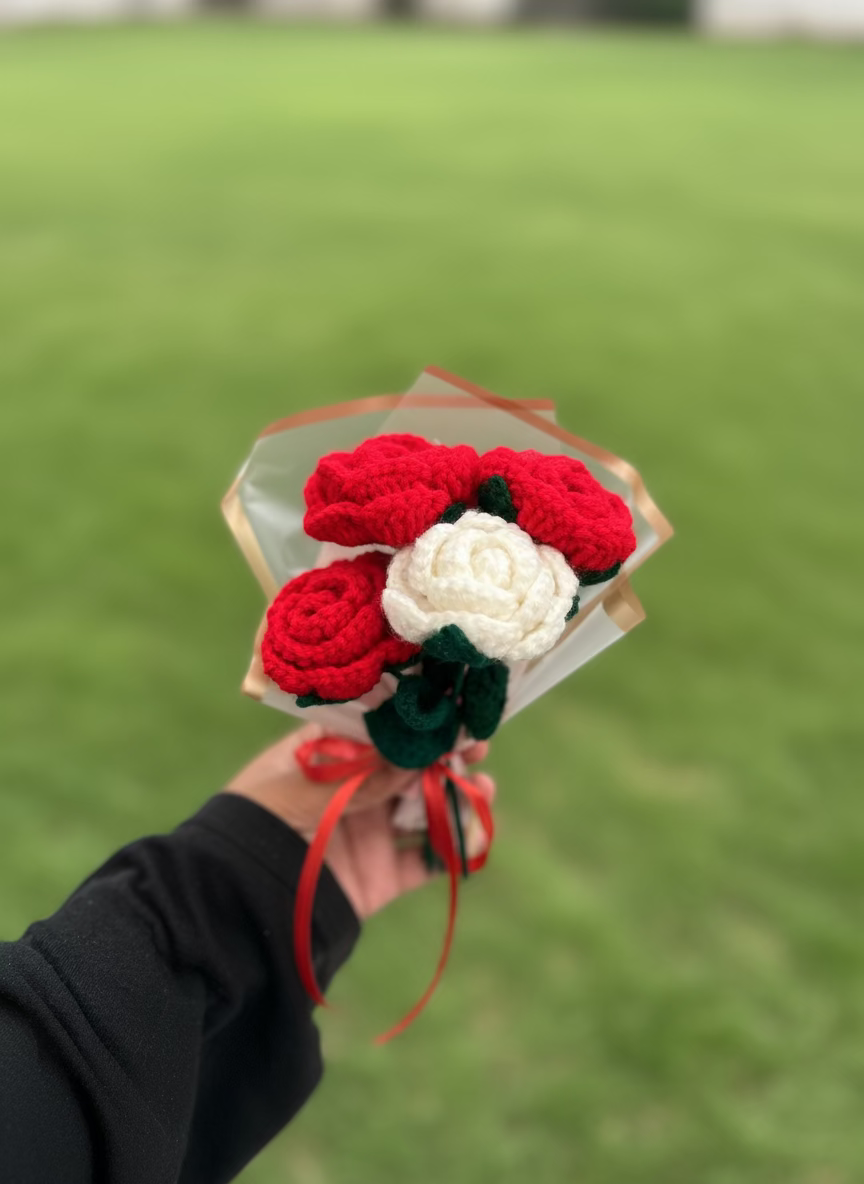 A sweet symbol of love and purity, handcrafted to make every moment thoughtful. This mini rose set features 2 red and 2 white crochet roses, carefully made with soft Ganga yarn, giving them a neat finish and a gentle, elegant charm.