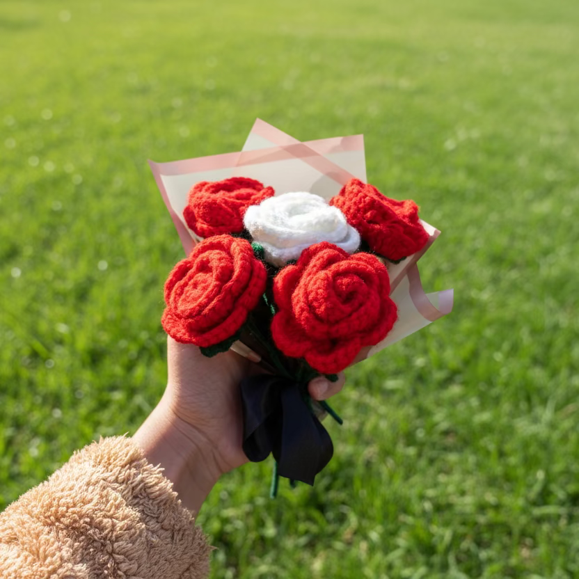 A stunning handmade 7-inch bouquet featuring four deep red flowers and one pure white flower. The red symbolizes love, passion, and admiration, while the white adds a touch of purity and serenity. Thoughtfully crafted, this bouquet is perfect for gifting, romantic gestures, or adding a handcrafted elegance to any space.
